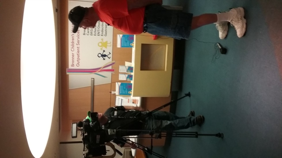 Gail giving an interview with a local TV station. We were not allowed to take any pictures of the children, but their reactions to the giant fruits were priceless.