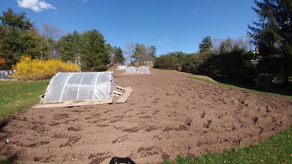 Garden is tilled. Hoop Houses are anchored in place to warm up the planting area.