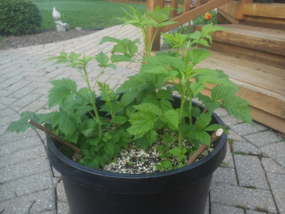 Back in march gurneys sent my raspberries in the mail so i planted them in these pots. They seem to be doinng ok.