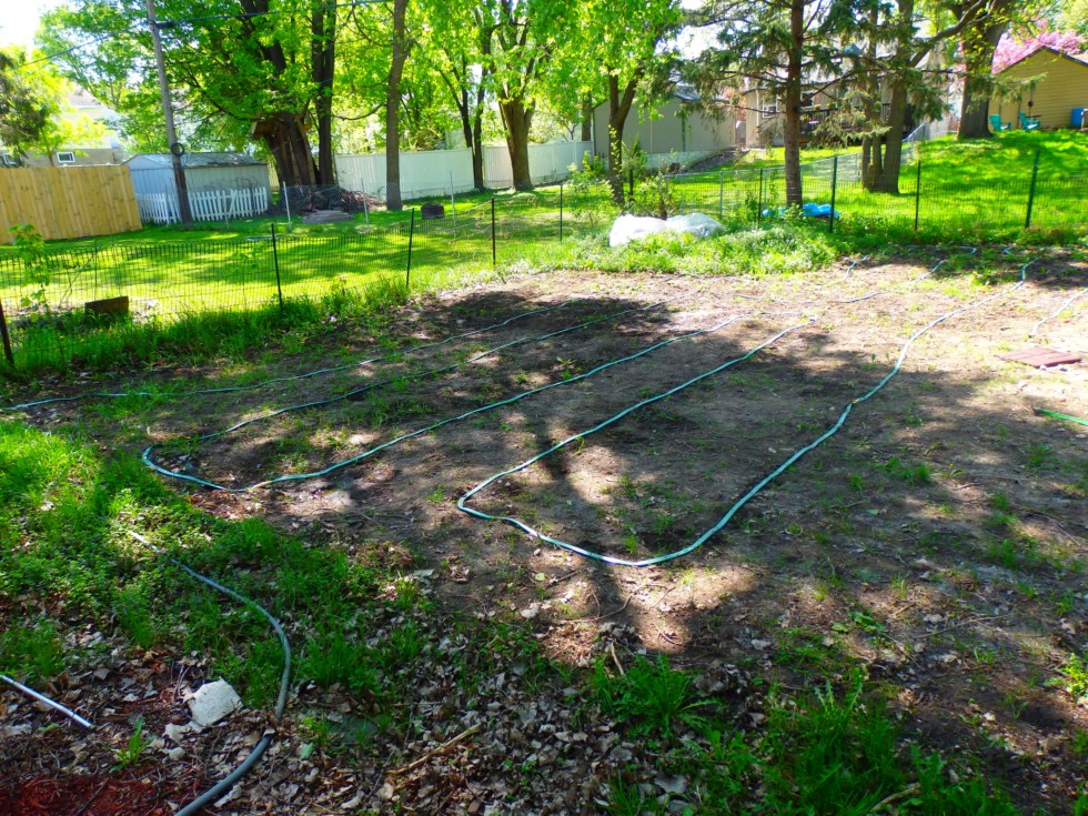 Economy watering system layout. Better than a lawn sprinkler. Waters using a mist instead of drops that can damage your plant. Have to be one continuous house to have enough water pressure to work. Used over 100 garden staples to secure sprinkler hoses to the ground. Had to attach hose to front of the house faucet to get enough water pressure - faucet is near where the city water pipe comes into my house. Still fine tuning to get all hose openings working properly.