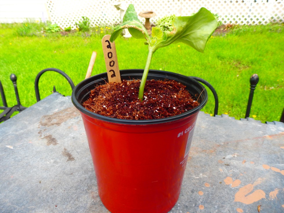 2002 now has its first true leaf. When I was in the garage looking in my germination chamber, I heard Messrs. Lawnmower, Weed Eater, and Gas Can talking about giving the 2002 a motivational talking to about growing a giant pumpkin. Mr. Weed Eater was ready to give the 2002 100 lashes as a reminder to grow a giant pumpkin.