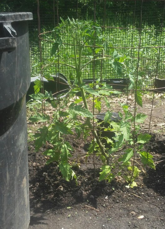 Eating tomatoes are about two feet tall. I have a garbage can next to it for scale