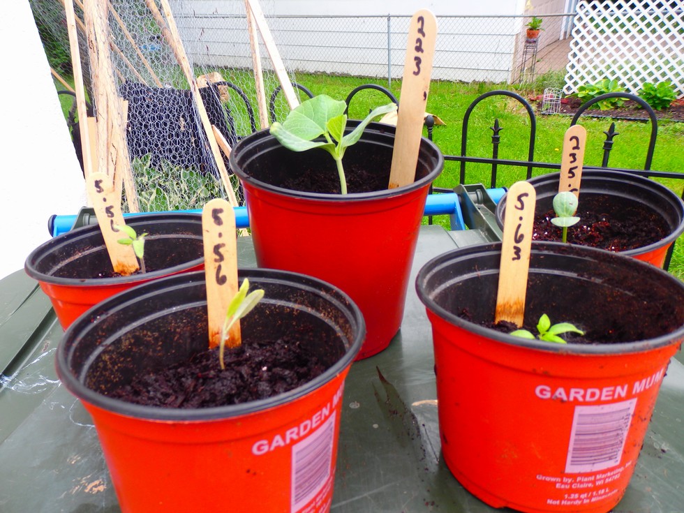 Upsized pots for 235.5 Neptune watermelon, 233 House bushel gourd, 2 5.56 Karkos tomatoes, and 5.63 Karkos tomato. Plants are now outside.