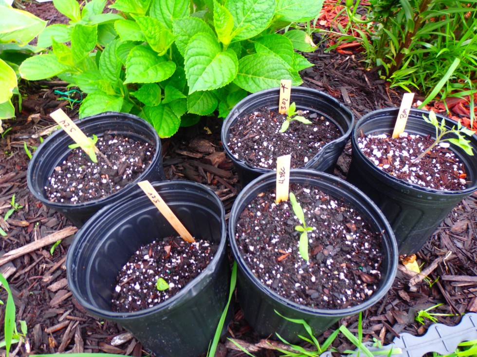 Tomato plants I acquired from Bnot in a trade. I traded him 3 Ganter 5.19, a Martin 4.54, and a Karkos 3.64 plant for 2 5.24 Borgers Megamutt D, 6.17 Zappa Brutus Magnum, 3.02 Borgers Wisom Slammer, and a 4.38 Borgers. I had an oops with one of the 5.24 plants on the way home from trading with Bnot.