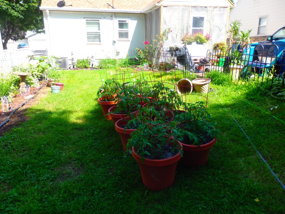 All my competition tomato plants. I have an experiment of Fox Farms Ocean Forest Potting Soil VS Miracle Grow Potting Soil going on. When I have more than 1 plant of the same seed, it goes into both soils. I would think the plants in the Ocean Floor potting soil will do better. I have color coded the soils. Red tomato cage is Ocean Floor and Green is Miracle Grow.