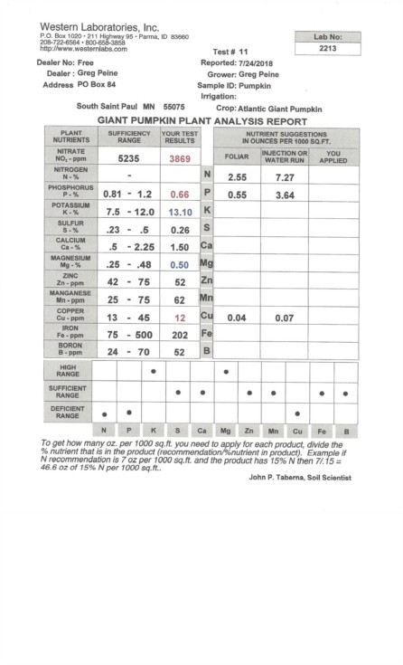 Tobeck 1836 Pumpkin tissue results. Looks like I will have to increase the frequency that I give the plants 20-20-20. I'll start with 3 times every 2 weeks instead of weekly.