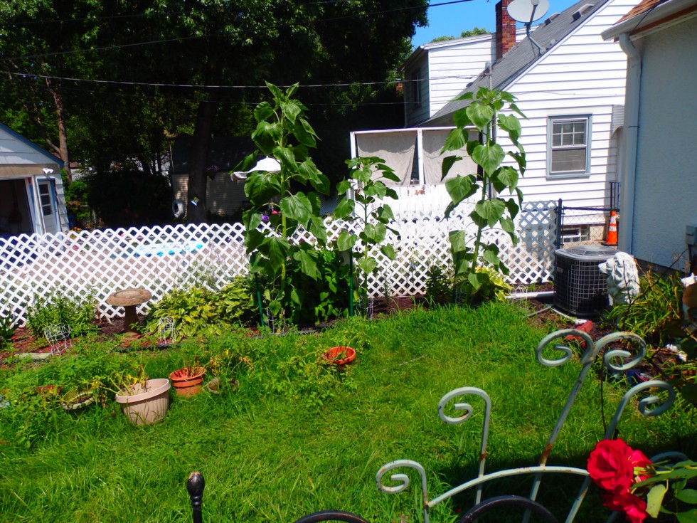 Big Head Sunflowers. About 10 Feet tall now. Put stakes in the ground alongside the plants after having to do an intervention to prevent flowers from tipping over. Have to tie them up before the wind tries to tip them over this year.