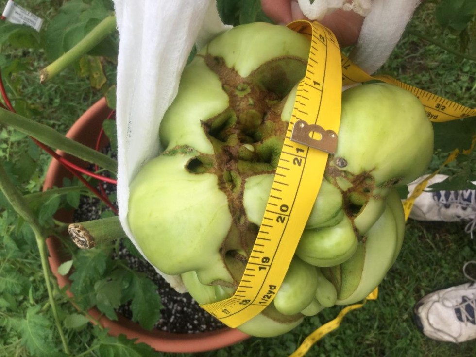I call this my Borg tomato because when it was smaller it was cubed shaped. When I would walk by it, it would say to me "I am the Borg tomato. I will win. Resistance is futile." I would tell it not to get ripe until October 8 or it will lose.