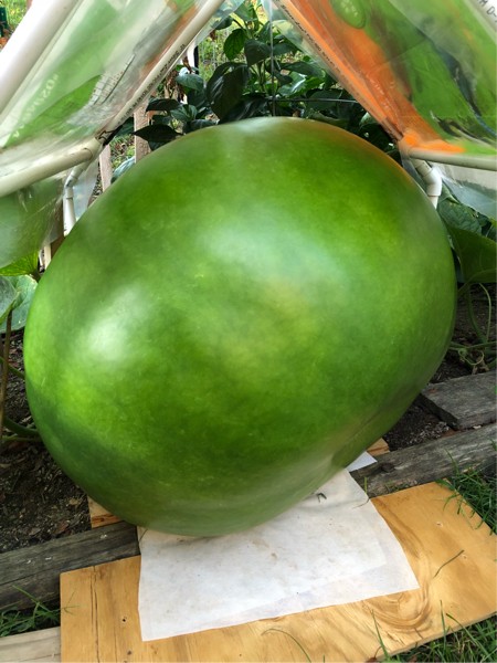 In the midst of a very hot and humid spell. We missed watering yesterday and it showed with only a 2.5 lb gain last night. Weight is estimated at 184.5 lbs now. Still no signs of cantelouping so hope the gains pick back up. Got a good dose of Holland�s Bloom this evening.