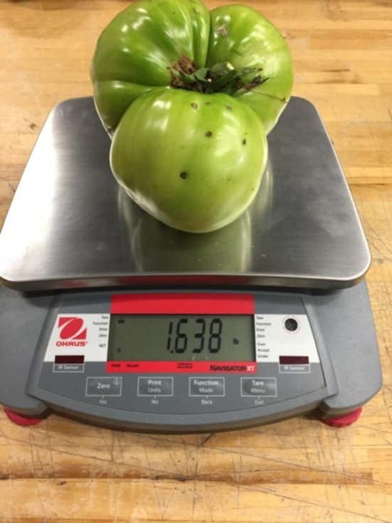 Had a great time with Bnot at early tomato weighoff at the garden place. This is a 1.64 pound tomato from a 4.54 Martin (7.45 Martin X open). I picked this tomato over a few others because Weird Wint wanted some seeds to grow from it. It hadn't stopped growing when I picked it.