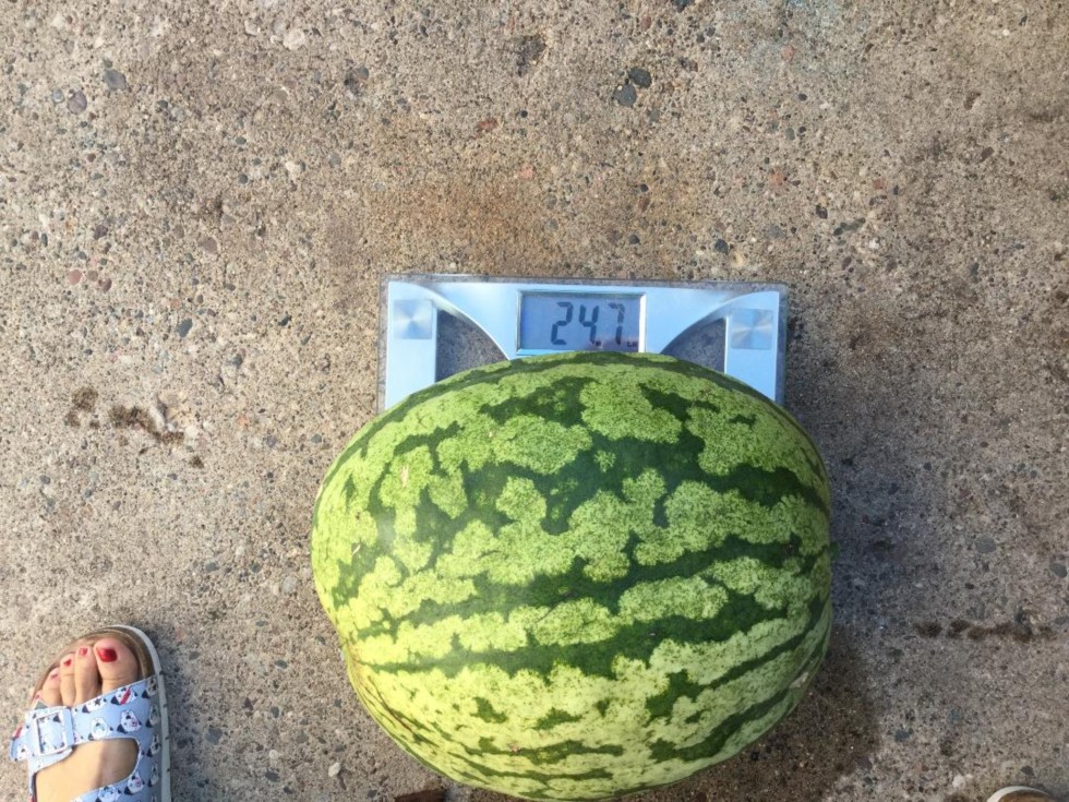 Picture of my damaged 270.5 X Open watermelon taken by my wife with her Ipad. Thought it would be much heavier. Should have known something like this was going to happen. 10 more days on the vine for my Tobeck 1836 X Tobeck 2002 then it will have good seeds. Might have to enlarge anti critter cage again. Have to take to Stillwater instead of Gale Woods.