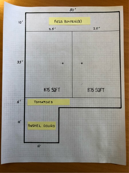 Preliminary plan for the big patch for next season. Only going with 2 plants in this spot. Possibly a third plant where I grew my 1103.5 this year. That spot is a 400 sqft patch that I originally started for growing veggies. Oops