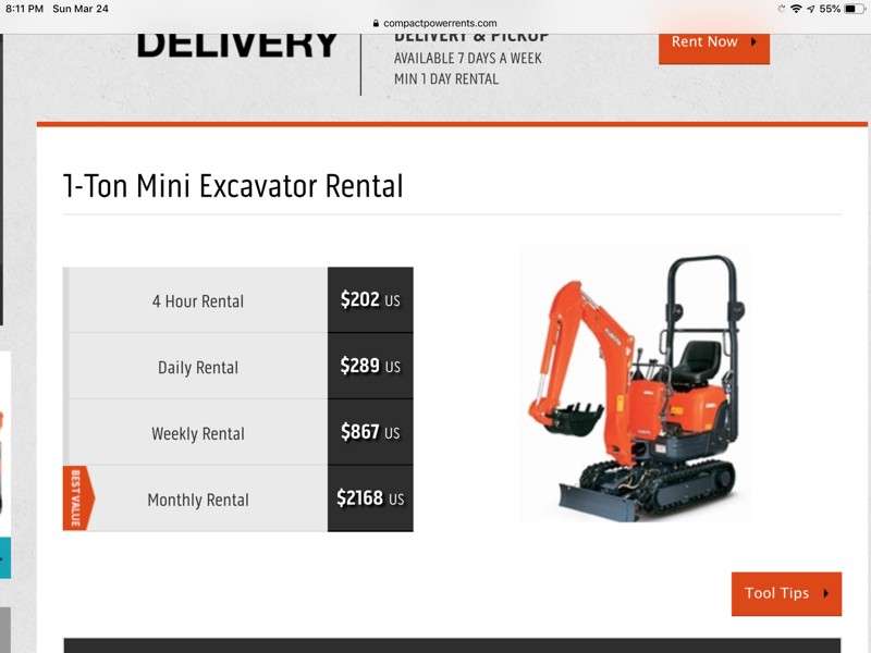 Renting this bad boy next weekend! It�s cheaper than hiring someone which would be like 700 bucks. This is 289 for a day. Not bad at all. It can get the job done as well. Will probably have to push the rock out of the patch. Should be great! It can dig down 4 feet. I�m excited