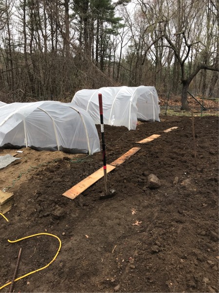 My stress level is definitely going down. I forked part of the patch. Want those amendments to really wash in. Heavy rain coming. Walking boards have been put down. I still think I will rent a tiller to top it off. I gotta get those doors on the sides of the hoop