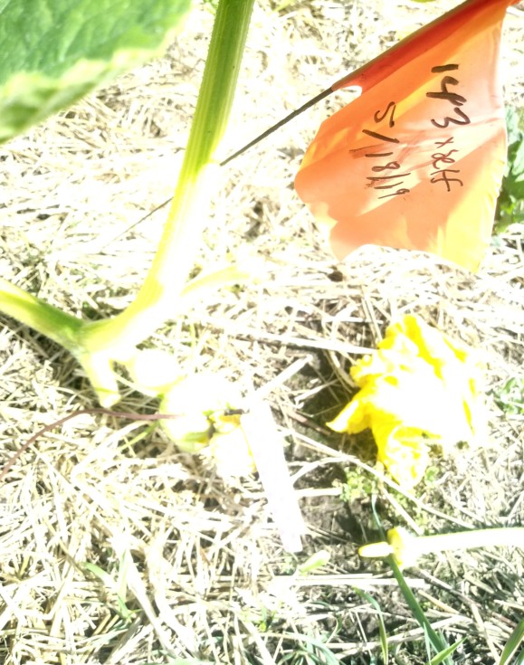 Pollination #2. On Butt-head, I mean Buttina. This entire plant is just 2-3 days behind 'Beavis'. Ideal conditions for pollination on this one, though. If she takes, then the battle is halfway over. (Thank goodness.) ...800 lbs with warts!!!