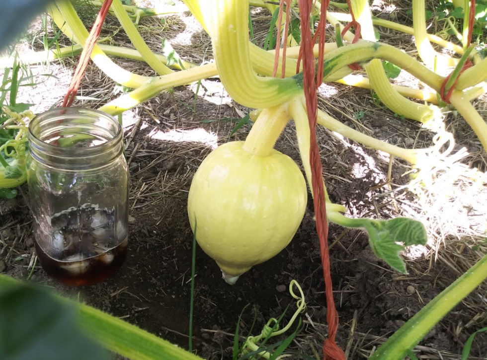 They should be able to hang at bowling ball size without any issue as long as the vines are tied in a way that wont kink. Next to a quart jar here not bowling size yet. Will put sand under this one... in a day or two. I am starting to think main vine sets are not compatible with blossom down growing because a side vine requires lifting only one vine. I will have to lift five or six vines here. .. That would be fine if I had only one plant. But, five or six vines multiplied by five or six plants? Equals lot of work, right.