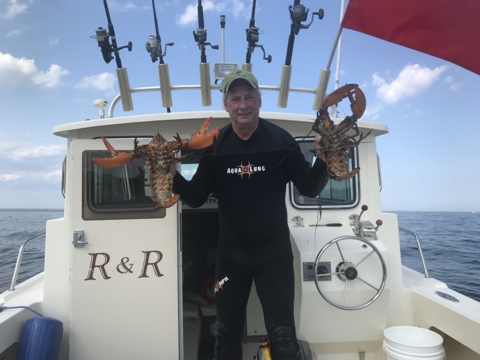 Great dive today. I caught eight big lobsters. Everyone of them were over three pounds. In July the big females come into shallow water to breed. We call this the Cow Season. This period is when you can catch the most per dive. In August, when they are all carrying eggs, it is illegal to take them.