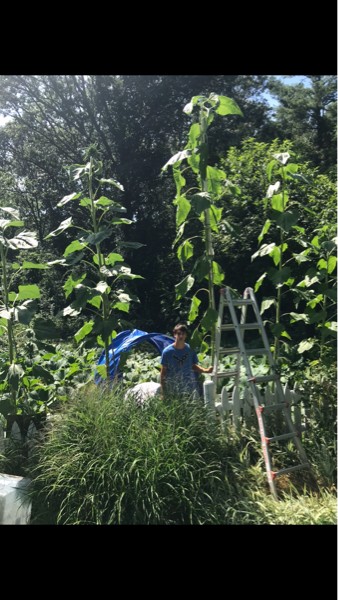 Giant sunflower! 15-16 feet now. Thanks to my sister she wrapped the top back around the pvc so it should straighten back out. Should gain a few more inches I think.