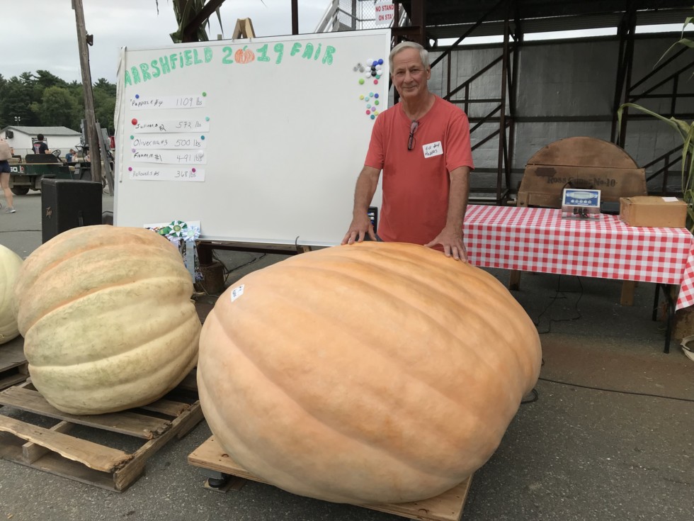Main vine and stem issues on the 2528 X 2469 forced me to take her to an earlier weigh-off than planned. At 1109 pounds, it took first place at the Marshfield Fair.