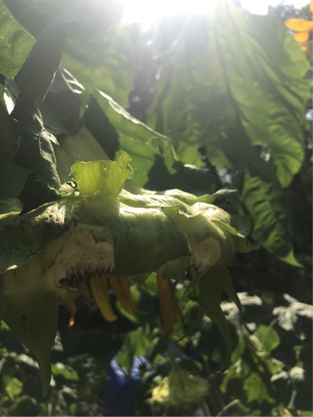 I know it�s a chipmunk because the side is chewed up a little. Other sunflowers have gotten attacked too.