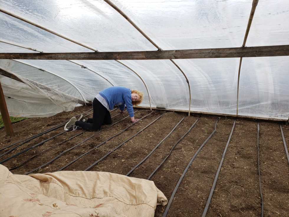 Rosalyn weeding the hoops prior to planting.