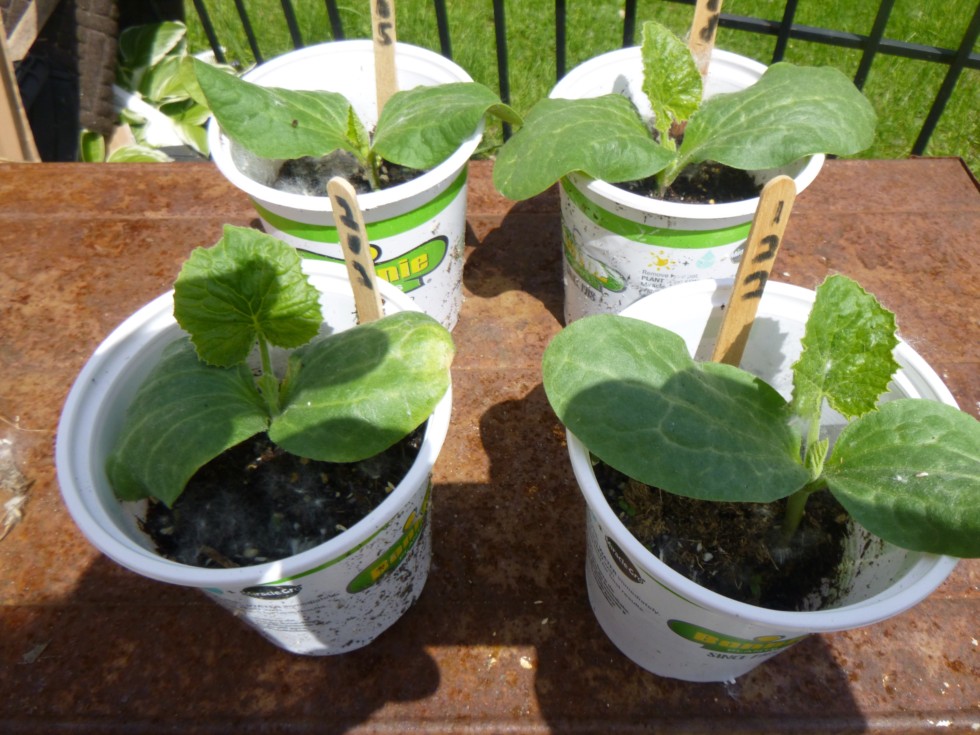205 Wursten and 188 Treece Field pumpkins (back) and 203 Fortey and 122 Lyons(220 Baggs X Self) Marrow plants ready to go into the patch,