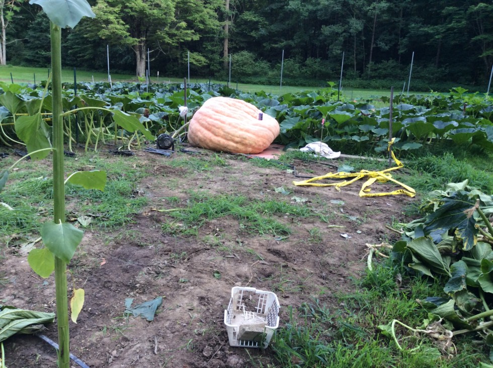 Here is Nemo after clearing the stump and a mess of side vines. It still has a nice amount of plant, but it will be very tough to get this one to 1800 plus pounds now. I would say i lost about 1/4 to 1/3 of the plant. Got some terts to clear out this week to keep good air flow under the canopy. When i cut the stump open. It was full of water, as well as most of the main up to the pumpkin. This one never showed any foam, so it really took me by surprise. I have to blame this on all the rain and very high humidity last week.