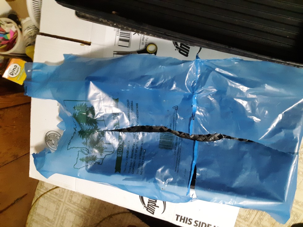 Once again I didnt realize grocery bag handles are on the ends whereas retail bag handles are on the sides. Its probably just as good or better this way but on this one I must cut the handles and leave dog ears. I should not have cut the bottom seam. It wont hold the plant well, everything will fall through when I try to lift it... Oops. Give me a second...