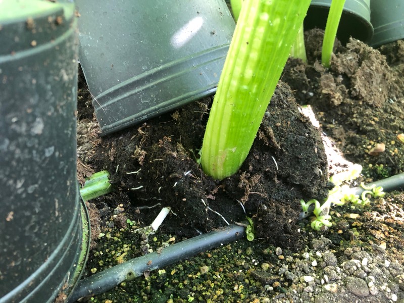 The area around the top root tends to get too dry before being fully developed. We water the last six feet or 2m to be covered over the top. Drip tape won�t cut it because you always get a dry V shape area between the lines.