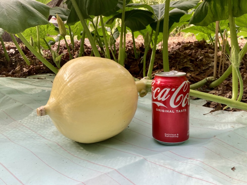 9 DAP. Perceptible gains. Feeling heavy when I lift it and relieve the stem pressure from the vine. I am doing the last training to the pumpkin stem itself; inching the blossom end counter clockwise to get the pumpkin shoulders to that final 90 degree position relative to the vine. The blossom end looks good.