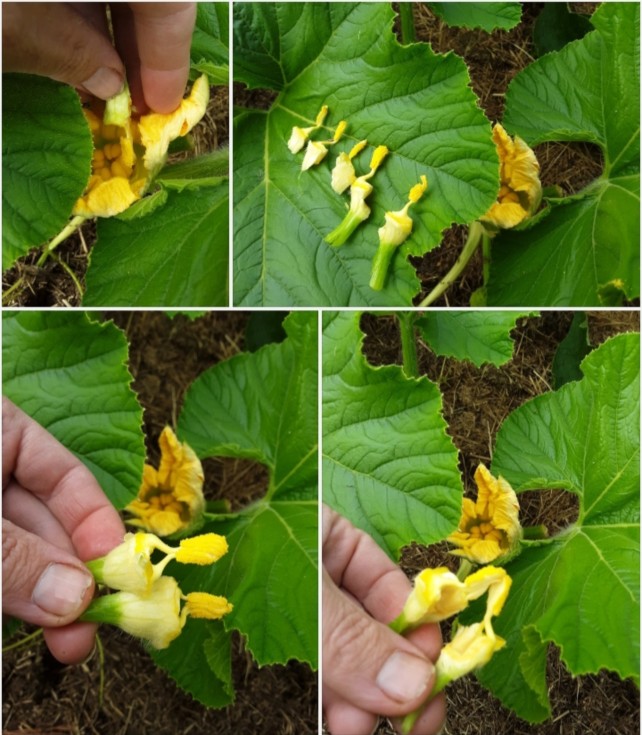 Clockwise from upper left, -A half anther fits better in the flower... -The anther can be split into even small pieces (this is all from one male blossom). -Splitting, starting at the base -Split complete