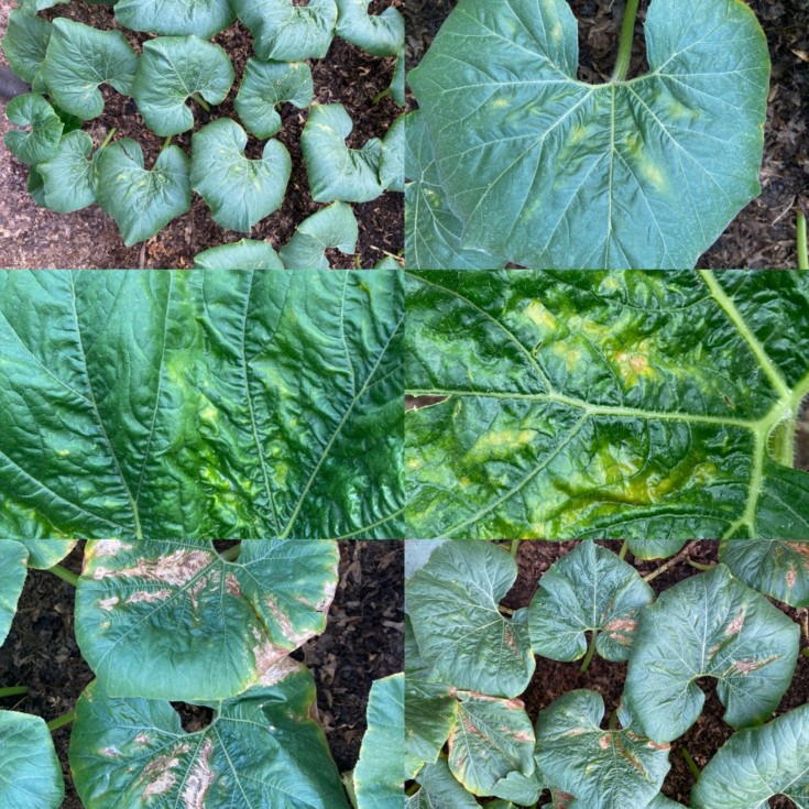 I�ve consulted the disease guide (http://www.bigpumpkins.com/Attachments/Leaf_Problems_Summer_2011.pdf) and the closest thing I can find is gummy stem blight. But it�s not, I don�t think. I am rotating Bonide Infuse, Daconil, and Immunox weekly. No PM to speak of.
