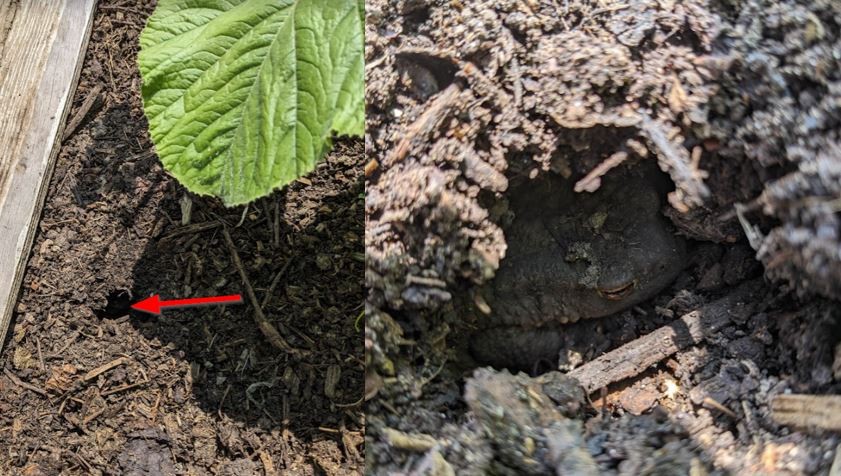 I moved one of the walking boards and saw this hole. That's a toad inside. They say they eat slug eggs and other pests, so I will leave him alone.