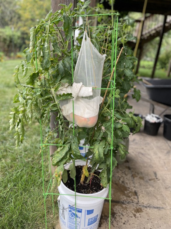 Here is one of my 5 gallon bucket plants with a fruit starting to color up.