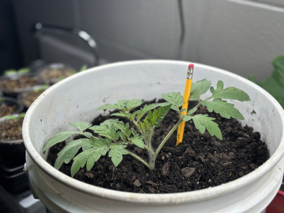 Transplanted into a bucket yesterday. She looks happy to be 3 weeks old.