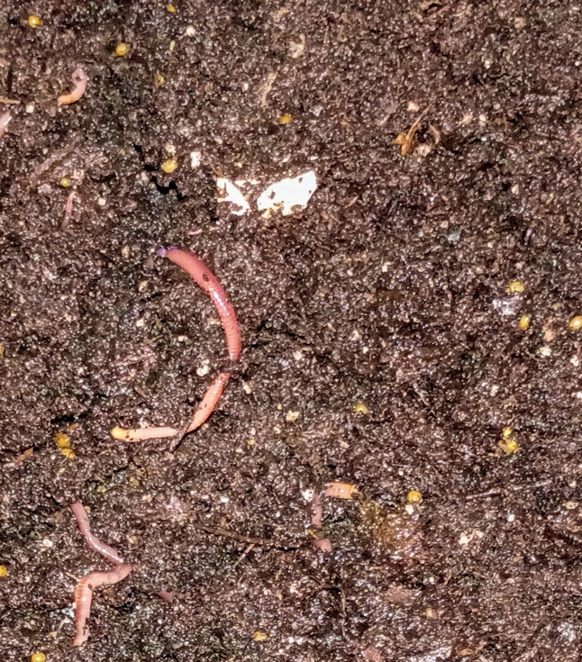 At the end of August I filled a 30 gallon tote to the top with leaves, grass, cardboard, garden scraps, a dozen eggshells, and a gallon of soil. I added about 30 worms I dug up(only red wigglers survived), drilled some holes in top and stuck it in my kitchen pantry. This is first check. Looks fine, plenty of evidenced cocoons too!(Yellow/amber circles) Lots of leachate too! There are many many many more than the 30 worms which you can't see but they are there!