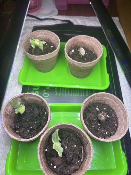 I'm on Day 7 since I planted my AG seeds into their peat pots! It took almost five days for them to sprout out of the soil but they finally emerged! To note, I decided not to file these and I placed them 1 inch into the soil in the peat pot, the soil I used is Miracle Grow Seedling Starter mix. The leaves look a little curled on the edges but I'm hoping that it's because they just emerged and haven't completely unfurled yet. I had them on a warming pad but removed it as soon as the first seedlings sprouted and applied their UV light, which I make sure to turn off every night and back on the next morning when I'm sure it's been off for at least 8 hours, so I don't think they're cooked or stressed. I've never grown something from seeds like this before so I'm worried about every little thing, but I plan to plant backup seeds next week after I transplant these.