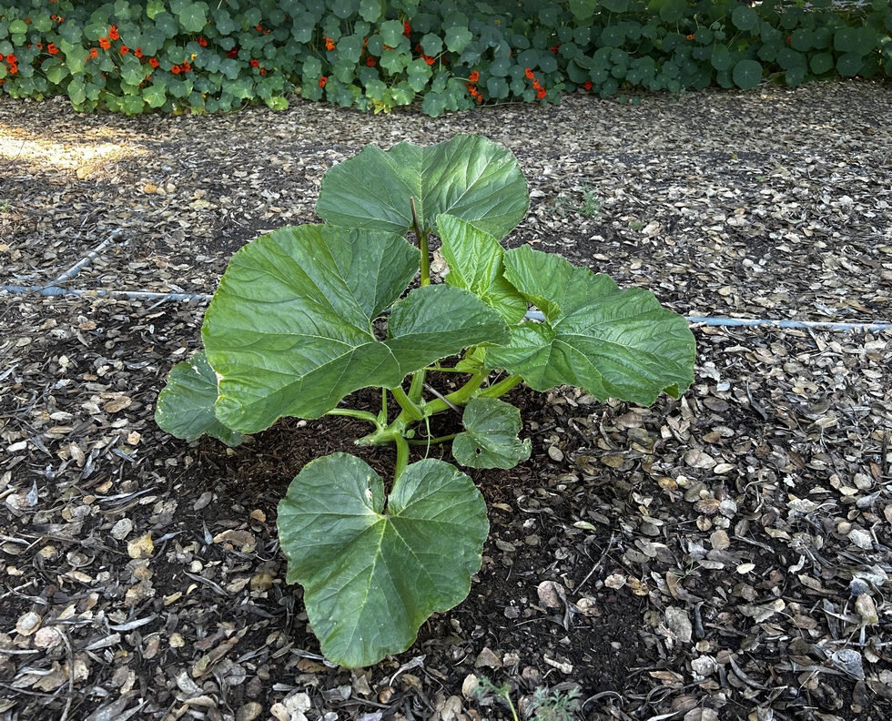 On the Run - My volunteer, named Gypsy Girl, has laid down and started to run. I gave her a second splash of water. That's it. No patch prep, no fertilizer, no wind or critter protection. She popped up in an awkward spot half under an oak tree. This definitely is all about how not to grow a giant pumpkin...