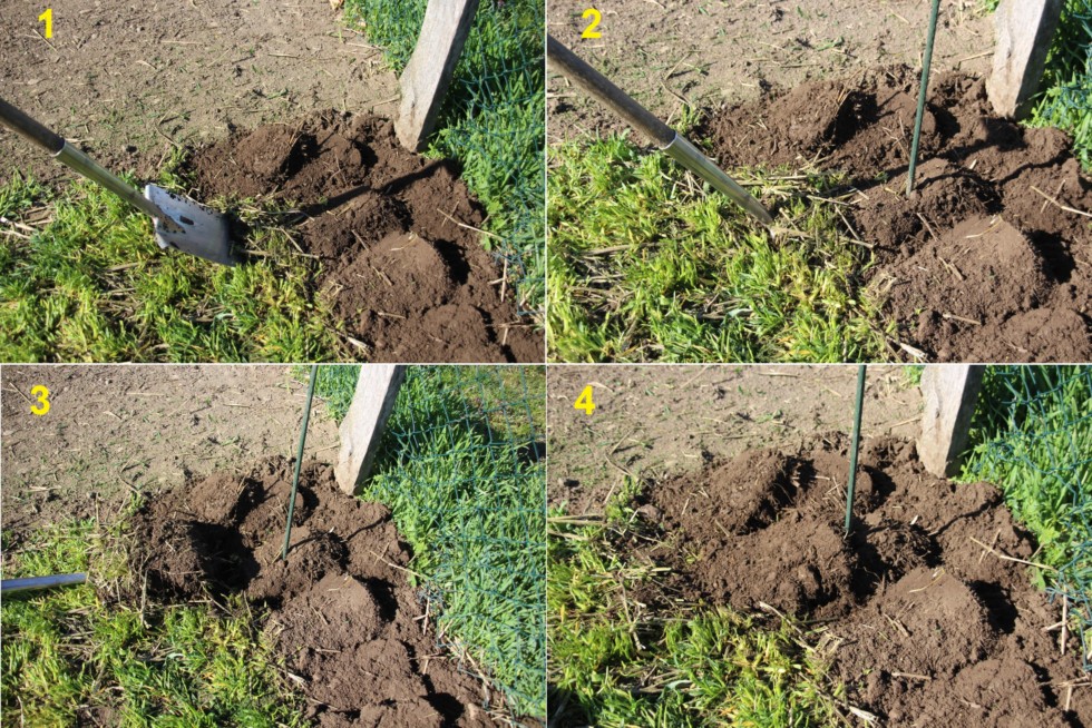 Step 4: Basically, this step goes hand in hand with step 3, but here I make it a bit more visible for you. As soon as I take such a 45 deg shingle out of the soil, from below the rim of the previous row, the rim collapses (and thus the greenery of the previous shingle, which is somewhere in this area, falls to a deeper level). For better visualization I have marked a shingle of the previous row with a green stake. So, I insert the spade at an angle of 45 deg (pics 1 and 2), and in pic 3 you can see the spade with the removed shingle as well as the collapsed rim of the previous row. Pic 4 gives you an impression that the 'mound', which results from that turning procedure, consists of the deeper part of the extracted and turned shingle (where there has not been any greenery, it was extracted from the lower soil areas below the previously turned row), and the upper part of the shingle (which contains the greenery) forms the rim of the current row, which will collapse and fall to a deeper level during the procedure of turning the next row of shingles.