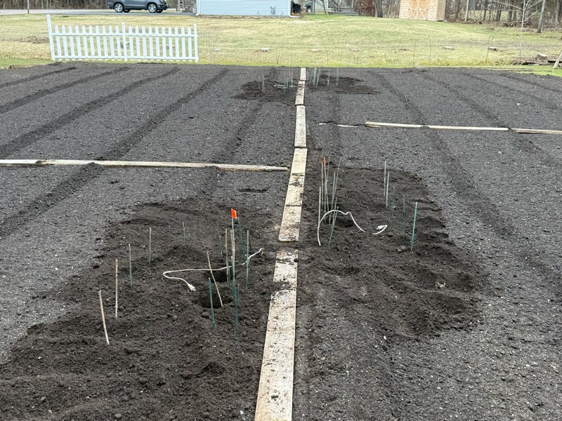 More patch work today. First we buried in the soil heating cables. We work as a team as I am a better shoveler and Kerry is a better bender placing the cables in.