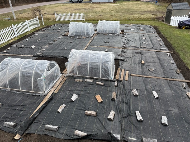 There. That's better. Now we are just waiting for the seedlings to mature and plant out. The last piece to add is the 250 watt infrared heat lamps after the plants go in the ground. We have been using the same firewood to hold down the weed block since 2013. Wonder how many times it has "warmed" us up? The weed block is also 14 years old. Pretty good investment!