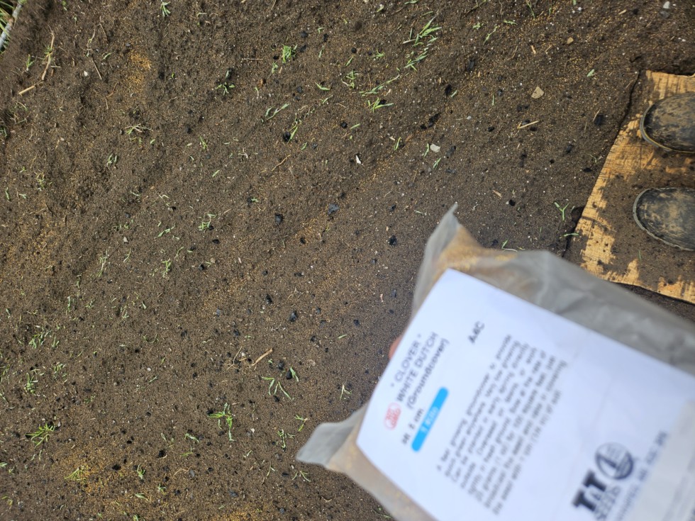 My hand sowing skills need some refining... Planting white clover in the greenhouse Theory is that living ground cover keeps soil temp lower, moisture evaporation lower, and potential light retraction from the white flowers.