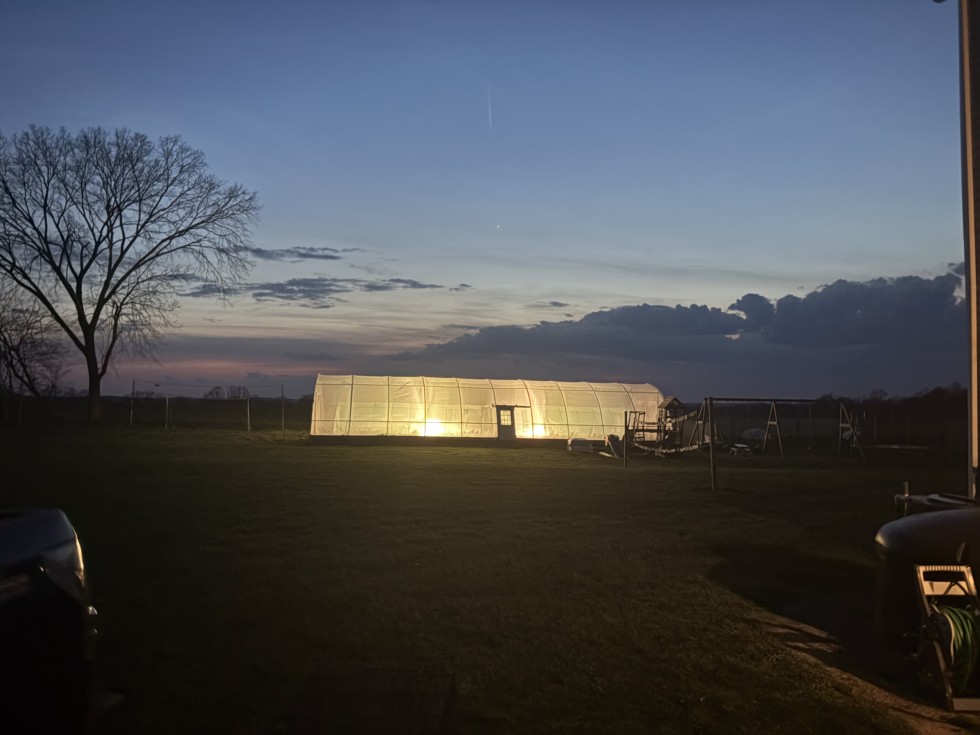 4/9/26 2,000watts of MarsHydro Leds run from 5am to 9pm every day. Soil is heated to 80F from 3' down to the top in a 14'x40' area inside the mini 14'x60' hoop house that is inside the 30'x65' screenhouse. Air temp is kept constant between 75-90F every day regardless of outside temperatures.